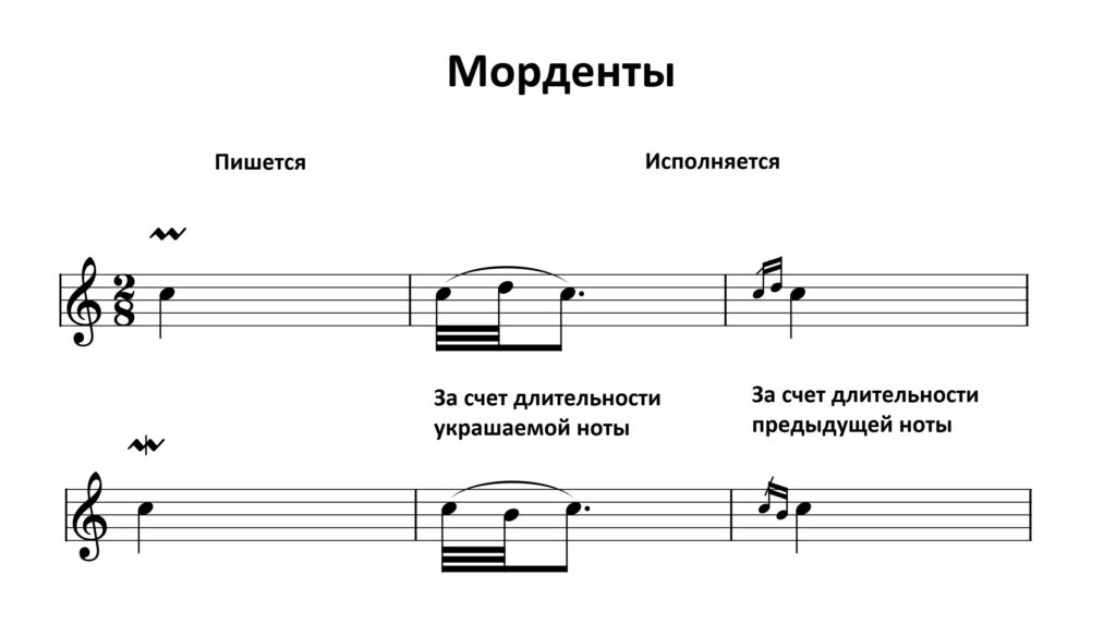 Короткое быстрое чередование двух звуков: основного и соседнего. Начинается на основном звуке. Морденты ( как и форшлаги) могут исполнятся как за счет предыдущей длительности, так и за счет длительности украшаемой ноты.