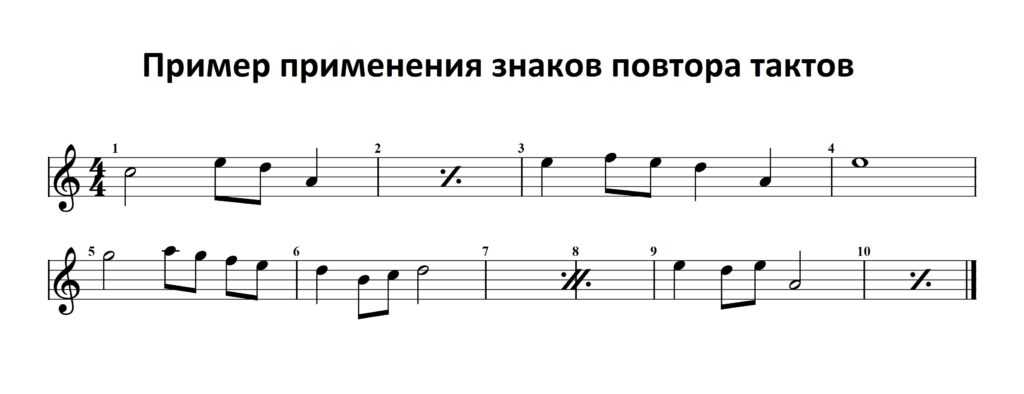 На рисунке 5 можно увидеть пример применения знаков повторения тактов. Во втором такте стоит знак повторения одного такта, что означает повтор предыдущего ( первого такта ). В седьмом и восьмом такте стоит знак повторения двух тактов, что означает повтор двух предыдущих тактов ( пятого и шестого ).