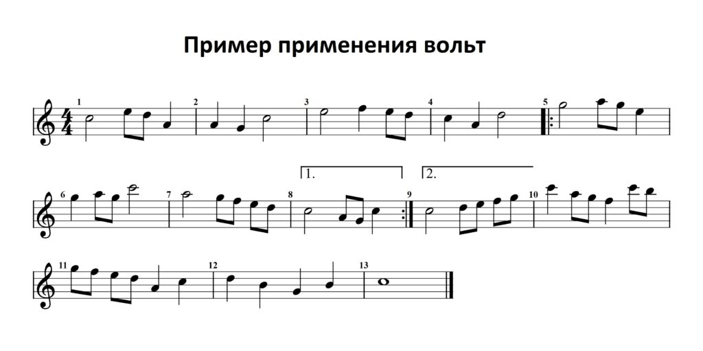 1-я и 2-я вольты — варианты окончания при повторе (обозначаются квадратными скобками с цифрами). В случае повтора части произведения при первом проигрывании исполняется такты под первой вольтой, а при втором (повторном) проигрывании такты под первой вольтой пропускаются и проигрываются такты которые находятся под второй вольтой ( см. рис. 4 ).